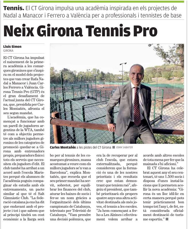 El CT Girona impulsa la creació del primer centre d’alt rendiment de tennis de les comarques gironines, pensat tant per a tennis base com per a tennis professional. L’objectiu del club presidit per Carles Montañés és poder retenir el talent tennístic gironí a casa, evitant d’aquesta manera la fuga a d’altres centres de tecnificació d’arreu de l’estat, oferint serveis de primer nivell. A més a més, el Club Tennis Girona ha arribat a un acord amb l’Escola Maristes per a que els jugadors puguin compaginar els entrenaments amb l’activitat acadèmica i docent.